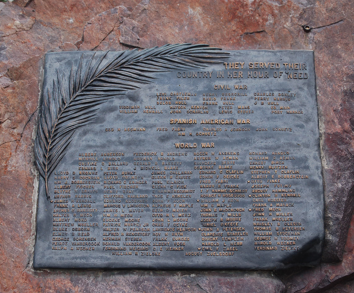 This plaque on the left side of the rock lists names of people who served in the Civil War, Spanish American War, and World War I. It shows "They Served Their Country in Her Hour of Need." Click on the above image to view a much larger photo, and click on that photo to enlarge it enough to read the plaque. Use your browser's BACK button to return to this page.